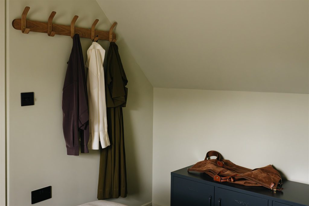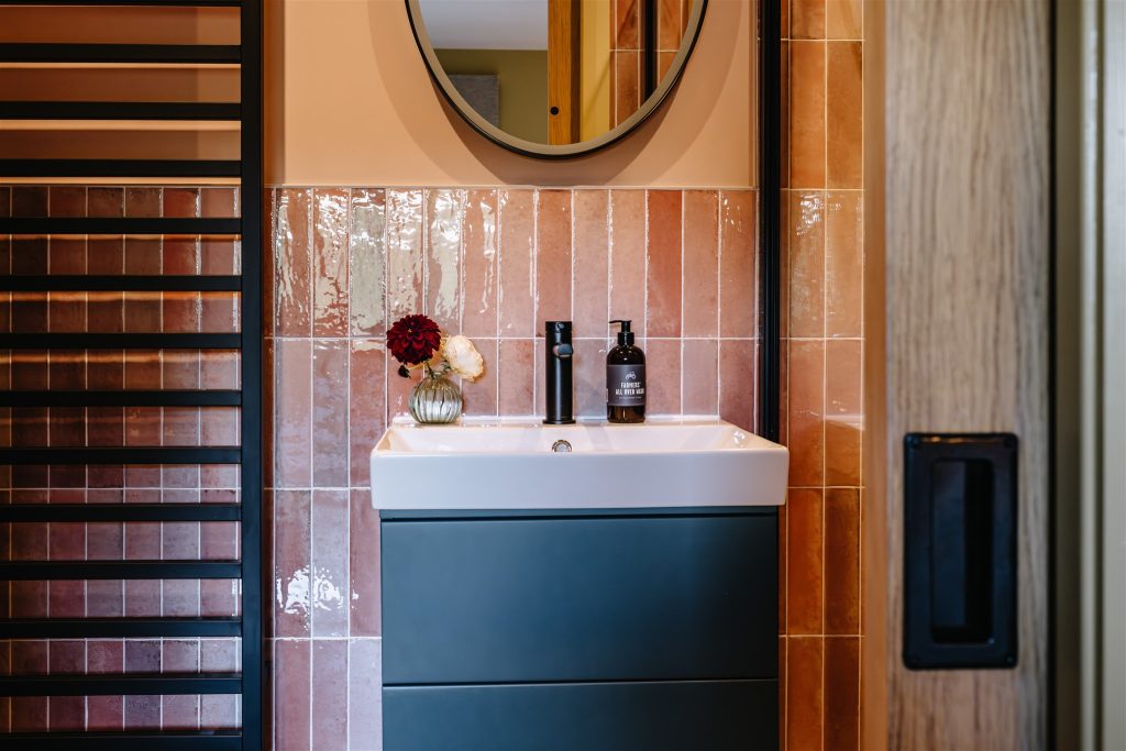 Enter via a stylish pivot door into light-filled oak-framed interiors blending tradition and contemporary design. Three mid-level king-size en-suite doubles offer easy access; two second-floor king-size rooms (one en-suite, one with hallway bathroom) provide elevated views. Distinctive features include garden access from bedroom two and a full-height picture window in bedroom five framing uninterrupted countryside, ideal for inspiration. Bathrooms feature refined Mandarin Stone pink tiles, sage vanities, and Edward Bulmer paints; original Su France Earth Pigment prints add character.
