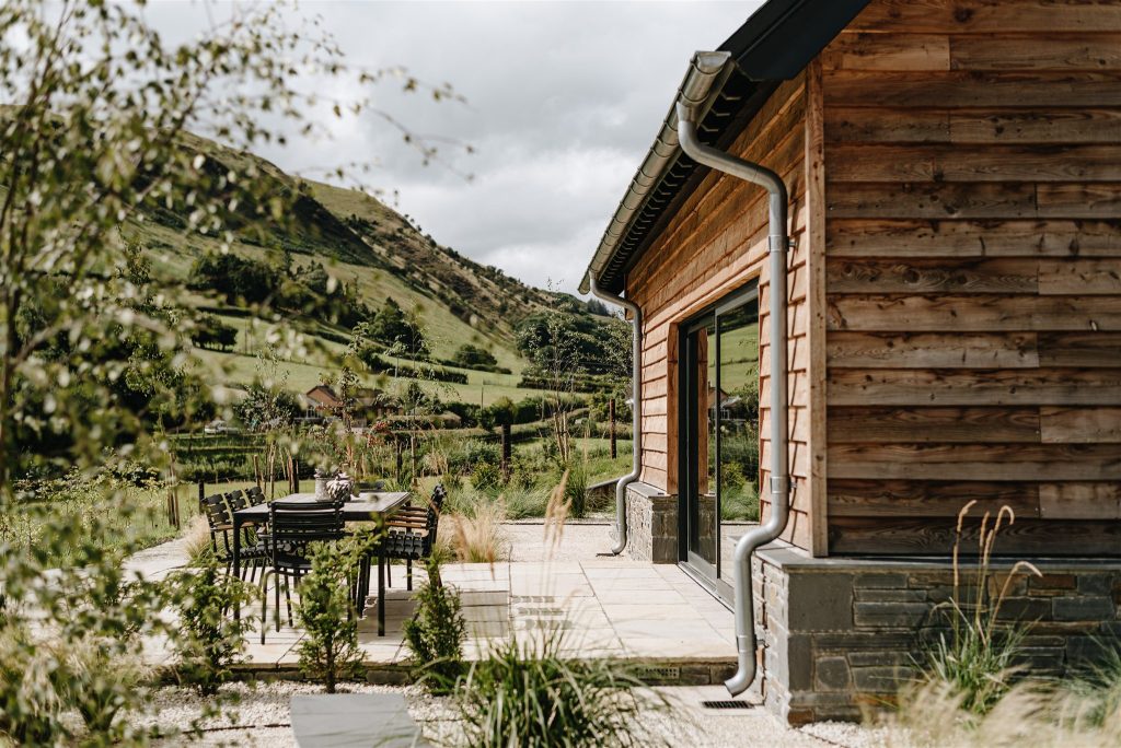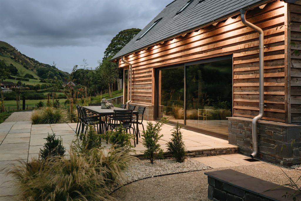 The kitchen draws from local Welsh stone tones, with high-spec Scandinavian lighting. Open-plan flow connects the equipped kitchen, sociable dining area, and living space with wood-burning stove, L-shaped sofa, and Ukrainian woollen hanging, prefect for collaborative hubs. Welsh larch cladding and Corten detailing integrate with the landscape. A grass-planted gravel garden leads to a stone terrace with native trees, 10-seater table, and space for morning strategy sessions, alfresco dining, or immersive countryside breaks.